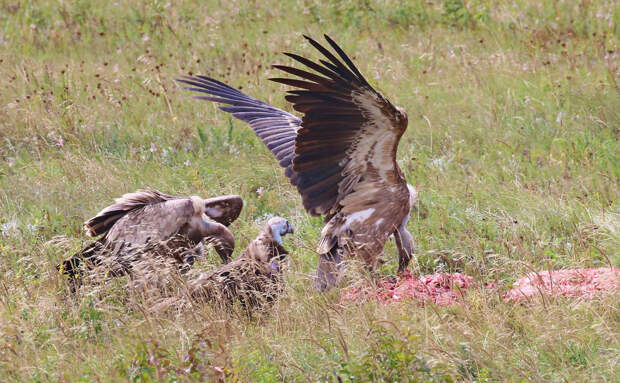 *Грифы первыми начинают поедать тушу: их мощные клювы легко вскрывают плотную кожу. Сипы дожидаются своей очереди: с помощью длинной шеи они добираются до внутренних органов.